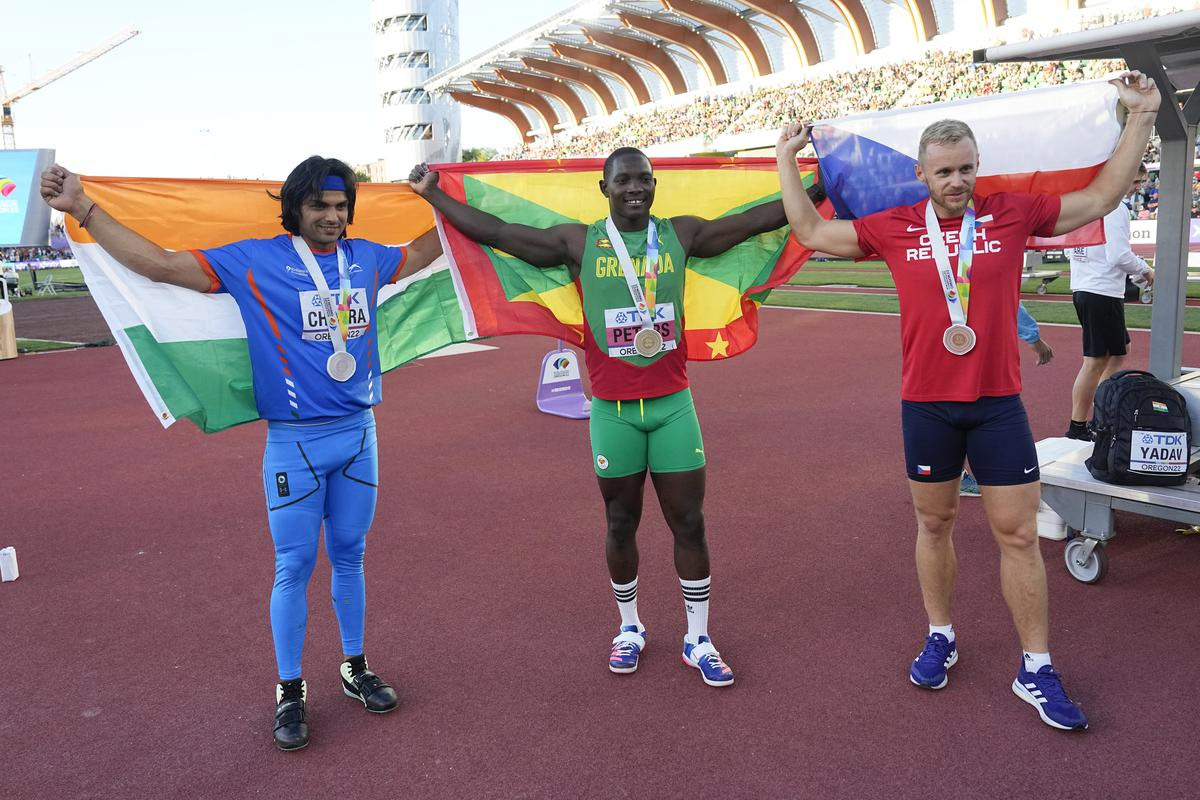 Gold medalist Anderson Peters, of Grenada, centre, stands with silver medalist Neeraj Chopra, of India, left, and bronze medalist Jakub Vadlejch, of the Czech Republic, celebrate after the men’s javelin throw final at the World Athletics Championships on July 23, 2022, in Eugene, Ore, U.S.