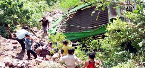 Wreckage of the minibus that rolled down in gorge near Barmeen causing death of 4 and injuries to 54 on Thursday.-Excelsior/ K Kumar
