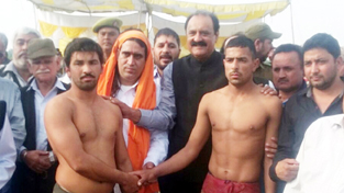 Wrestlers being felicitated by former Minister Surjit Singh Slathia at Vijaypur in Samba. By Daily Excelsior - November 12, 2015 Share FacebookTwitterWhatsAppPinterestLinkedinCopy URLTelegramEmailTumblrReddItPrintKoo Wrestlers being felicitated by former Minister Surjit Singh Slathia at Vijaypur in Samba. Wrestlers being felicitated by former Minister Surjit Singh Slathia at Vijaypur in Samba. Follow our WhatsApp channel