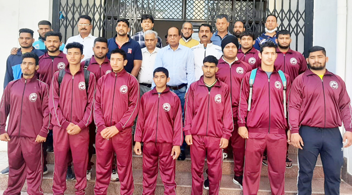 Wrestling team posing for group photograph with Divisional Sports Officer Jammu, Ashok Singh and others at Jammu.