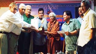 Writer-journalist, Rajeshwar Singh Raju, receiving Prof Ram Nath Shastri Memorial Award from dignitaries at Jammu on Wednesday.