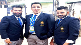 Wushu players Surya Bhanu Pratap (L) and Pardeep Kumar (R) posing for photograph alongwith chief coach of India, Kudeep Handoo (C) after entering semis at South Asian Games.
