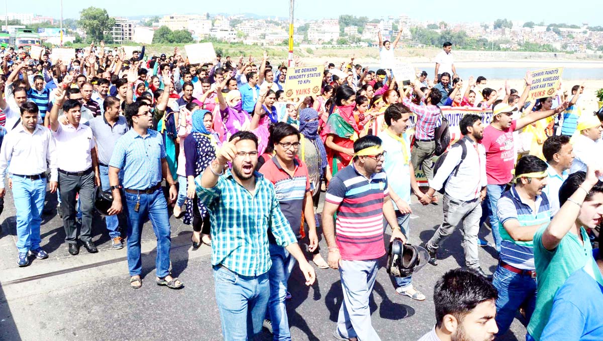 The rally was led by R K Bhat, president YAIKS. The rallyists also blocked Tawi bridge and disrupted the movement of vehicular traffic . At Divisional Commissioner’s Office the protestors demanded settlement of the long standing issues of the displaced Pandits in general and youth of the community in particular by implementing the PM’s employment package in letter and spirit and settling the other problems of the package employees by providing them the required accommodation and other facilities as was promised by the Government while announcing the package.