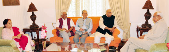SRINAGAR: Sh. Yashwant Sinha, former Union Minister, accompanied by Ms. Sushobha Barve, Executive Director, Centre for Dialogue and Reconciliation (CDR); Air Vice Marshal (Retd.) Kapil Kak and Sh. Bharat Bhushan former Editor and senior journalist, met Governor N.N. Vohra at the Raj Bhawan here today. Sh. Sinha and his team are visiting the Valley to talk to the leaders of various parties and groups about the issues facing J&K.