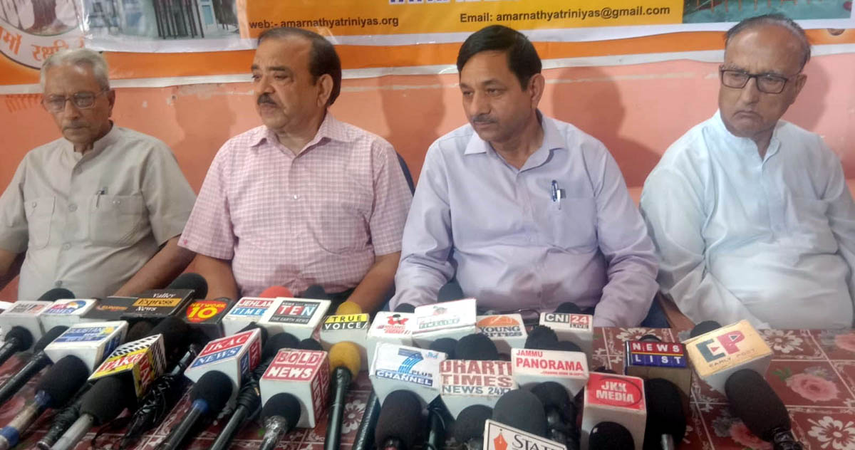 Office bearers of BABA Yatri Niwas addressing media persons at Jammu on Saturday.
