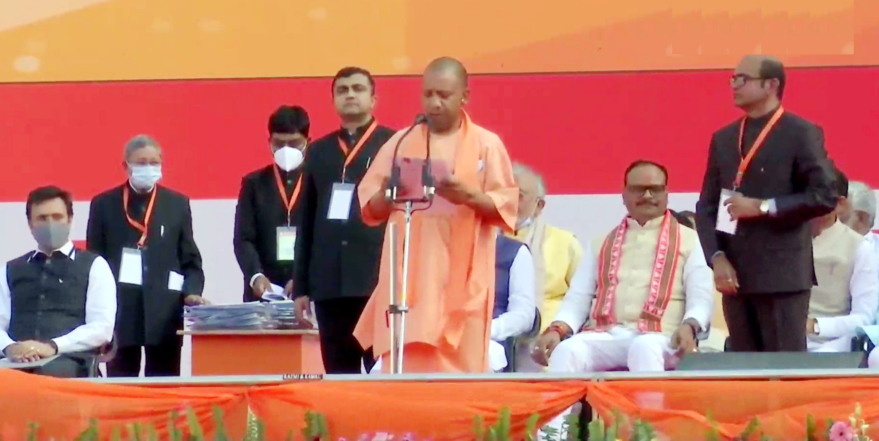 Prime Minister Narendra Modi, Defence Minister Rajnath Singh, Union Home Minister Amit Shah and several Union Ministers were present at the grand ceremony in Lucknow’s Ekana Stadium. Chief Ministers of the BJP ruled states and party leaders also attended the oath-taking ceremony.