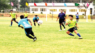 Young footballers in action during a match of ‘Oorja’ Football Talent Hunt Tournament at University Ground in Jammu on Wednesday. -Excelsior/Rakesh