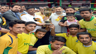 Young footballers posing alongwith Minister for Sports, Imran Raza Ansari and other dignitaries during inaugural function of Sheikh-ul-Alam Knockout Football tournament in Srinagar.