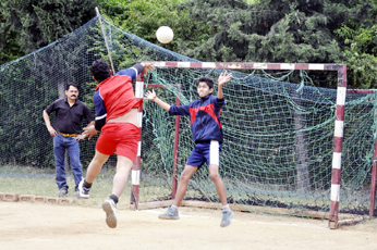 Young handball player jumps in the air while trying to shoot the ball inside the goal posts during Inter-District Handball Competition in Jammu on Monday.