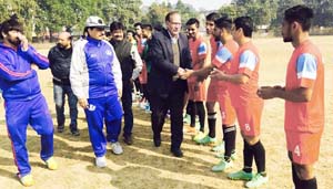 Dignitaries interacting with footballers during a match of Mufti Mohammad Sayeed Memorial Gold Cup.