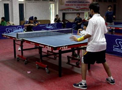 Young peddler prepares for execution during a match of Ist Police Martyrs Memorial Table Tennis Championship at Indoor Complex in MA Stadium, Jammu on Monday. -Excelsior/Rakesh