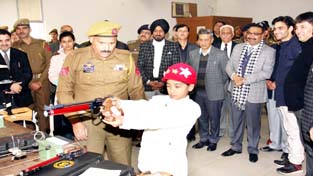 Young shooter displaying his skills while DGP Dr S P Vaid and other dignitaries watch him during felicitating function in Jammu.