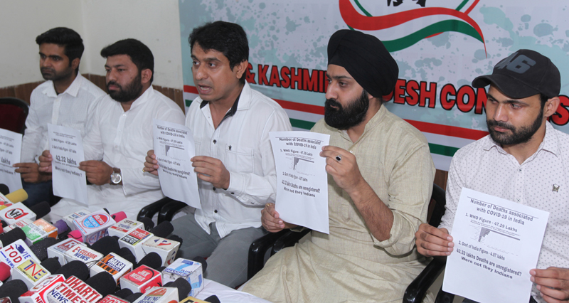 JAMMU, May 9: Attacking the Centre over the WHO’s estimation that India had 4.7 million (47 lakh) Covid-related deaths, the J&K Youth Pradesh Congress has demanded setting up of a Commission with members from all parties to ascertain the number of fatalities. Addressing media persons at Congress Head Office in Jammu today, Uday Chib- President J&K PYC, accused the Central Government headed by the Bharatiya Janata Party of `under-reporting’ Covid deaths and asking if it was a way to “escape” paying compensation to the families of the deceased. He alleged that the Modi Government has let India down on the world stage once again.