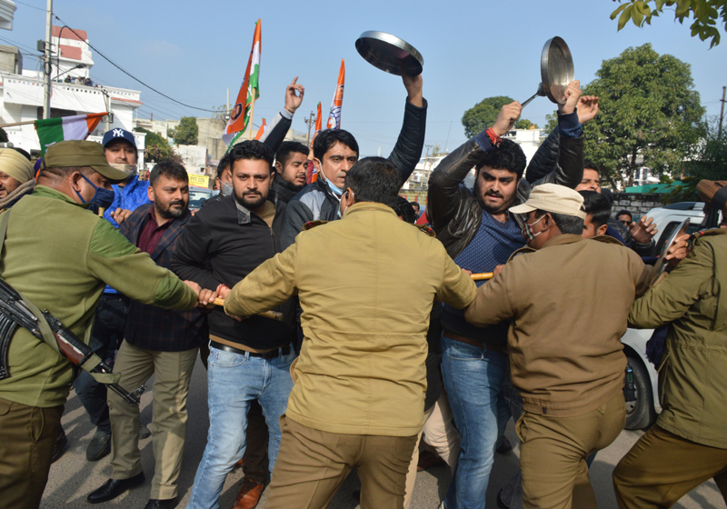 JAMMU, Jan 12: The Jammu and Kashmir Youth Congress today staged a strong protest demonstration in front of the Bharatiya Janata Party office here, by banging utensils to wake the Narendra Modi-led Government at the Centre which is not able to see the deaths of farmers who have been protesting against the three farm laws for more than 2 months now.