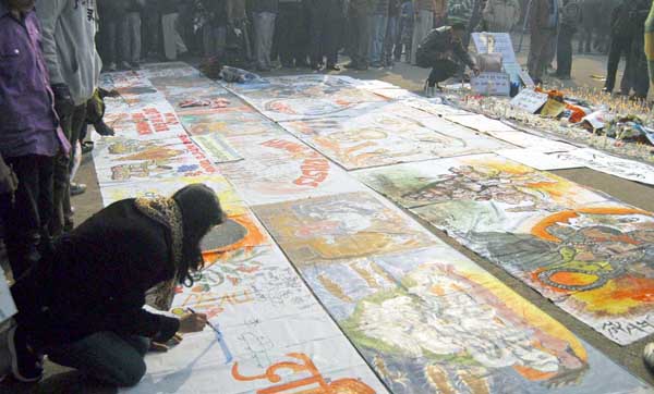 Youth making a huge painting during their dharna at Jantar Mantar in protest against the Delhi gang-rape and demanding safety of women in New Delhi on Tuesday .(UNI)