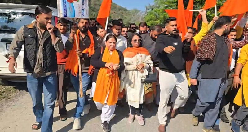 KATRA, Nov 17: Up in arms over the recent MBBS admissions at the newly established Shri Mata Vaishno Devi Institute of Medical Excellence (SMVDIME), a strong protest was held today by members of Yuva Rajput Sabha, Movement Kalki, Bajrang Dal and other Hindu organisations against the Shri Mata Vaishno Devi Shrine Board (SMVDSB).