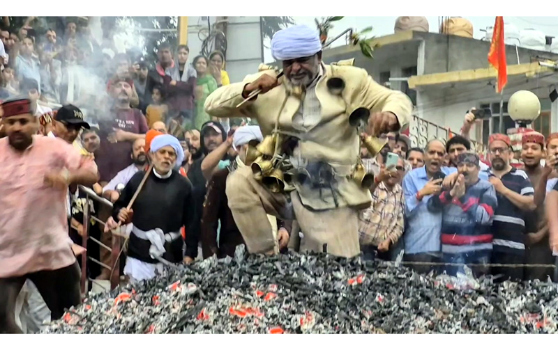 BHADERWAH, Aug 24: Despite heavy rainfall, ‘Zagru’, a midnight to dawn ritual of ancient Nag culture, in which Chaillas (priests) enter huge bonfire barefooted, was performed here today in the presence of thousands of devotees of Lord Vasuki Nag at ancient Vasuki Nag Temple in Gatha area.